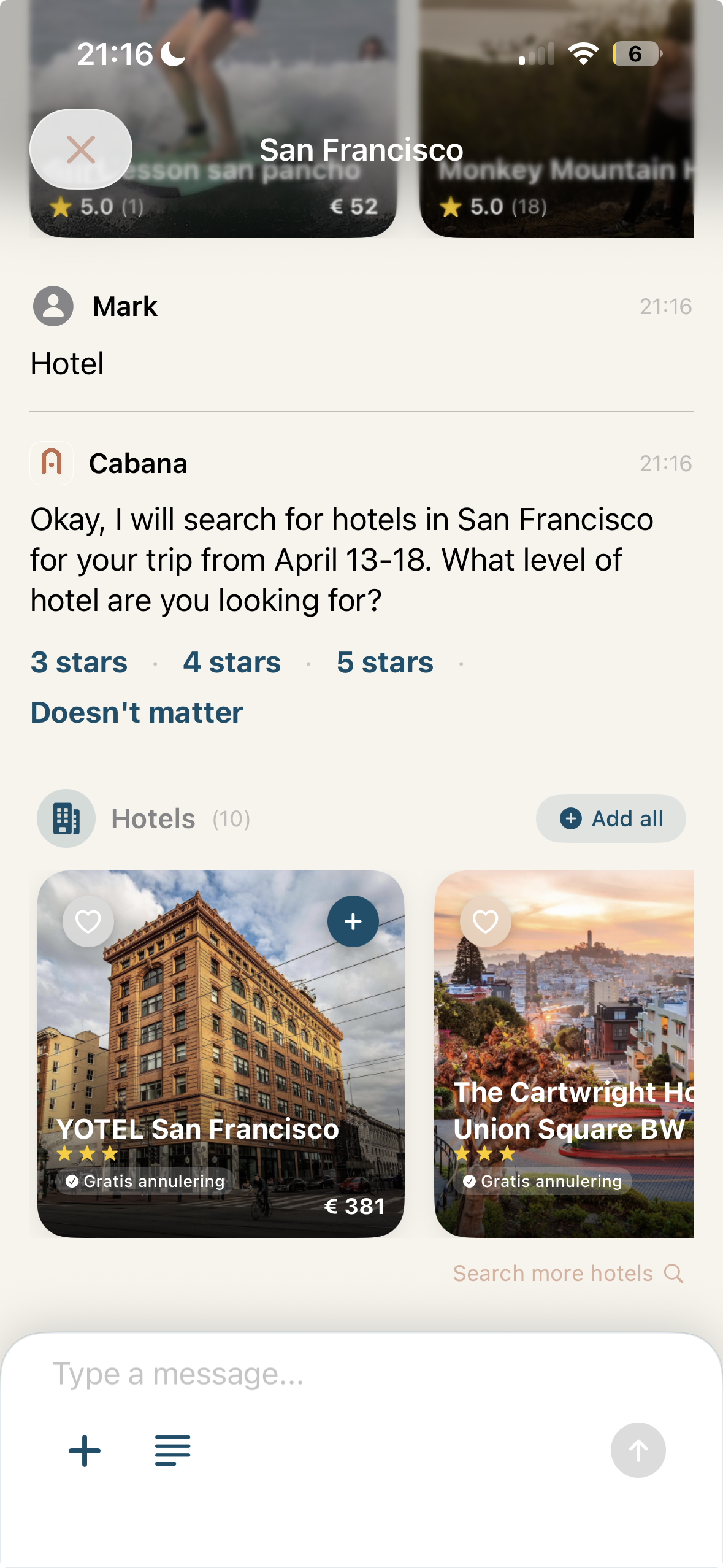 Chat with your personal Cabana travel advisor to build the perfect trip together. Share your ideas, preferences, and budget — and refine every detail through natural conversation until the itinerary feels exactly right. Flights, hotels, activities — all planned collaboratively, not generated blindly.