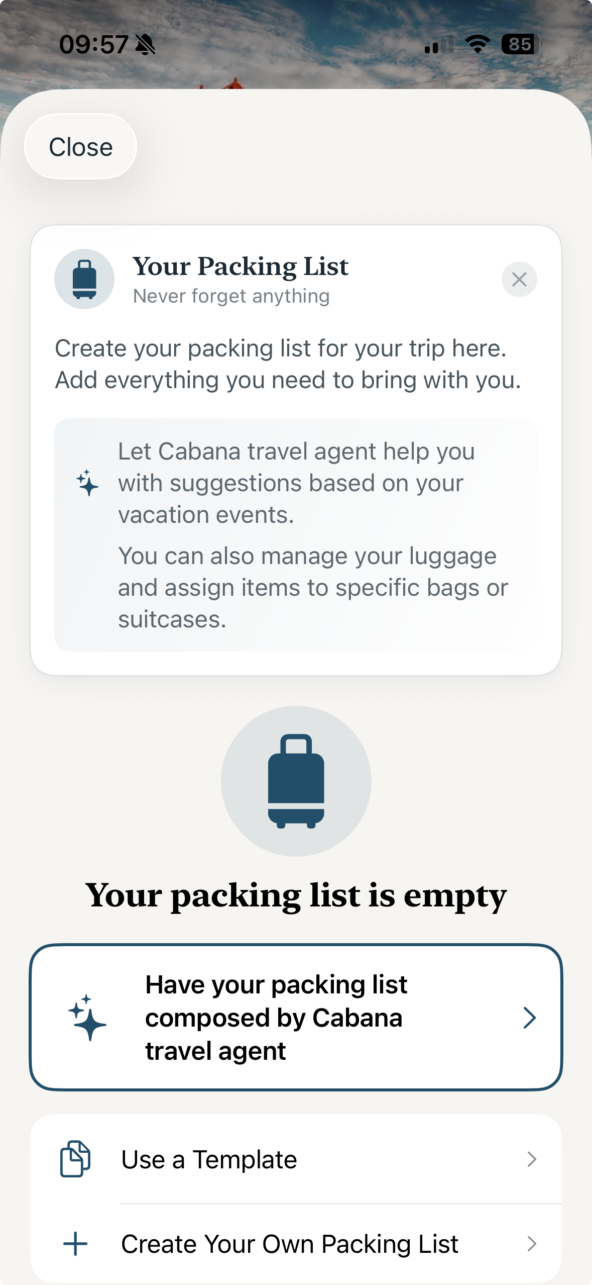 Learn moreCabana generates a packing list tailored to your destination, weather forecast, and planned activities. Check items off as you pack and share the list with your travel companions.