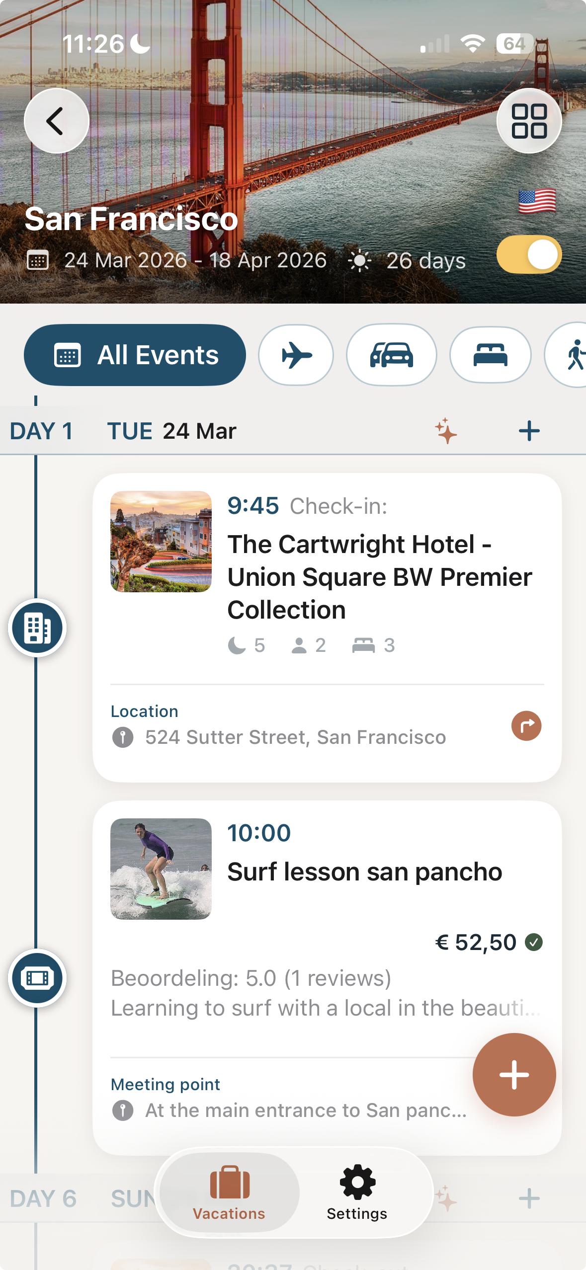 Learn moreSee every detail of your vacation in one beautiful chronological timeline. Flights, accommodation, transfers, and activities — organized day by day so you always know what's next, wherever you are.